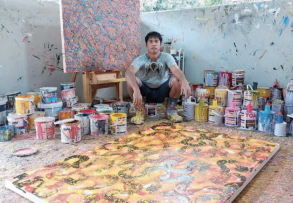 Jeune diplômé, il reprend le pinceau et laisse libre cours à son art en créant dans un minuscule atelier de 9m2. C’est dans ce lieu clôt qu’il parvient à expérimenter une technique qu’il explore en autodidacte avec toutes les contraintes que cela implique : le manque d’espace et l’hygrométrie élevée qui règne à Bangkok.