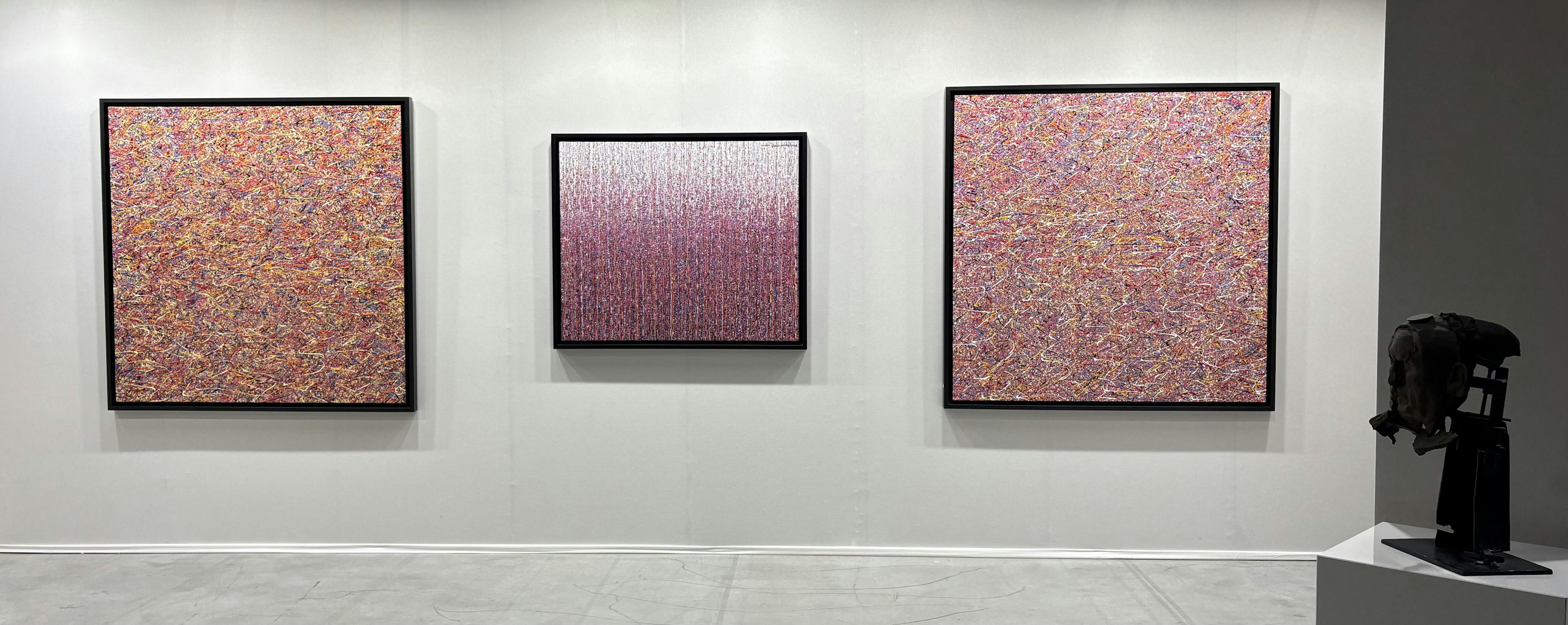 Face à la toile et avant le premier coup de pinceau, Somsak connaît déjà la trame de sa mise en œuvre ; il sait exactement où il compte se rendre au point près. Tout est inscrit. Chaque détail est méticuleusement programmé, chaque coup de pinceau est tracé selon un procédé algorithmique ou chaque élément est soigneusement inscrit et structuré dans un ensemble équilibré et harmonieux. Sur la toile, Somsak détermine un fond, y intègre une vague de points ou un dégradé de tâches, suivi par des lignes, serrées les unes contre les autres, allant parfois même jusqu’à la superposition.